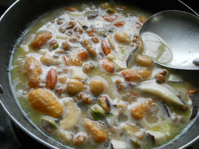 Method:Take water in a microwave cup. Microwave on high power for 3 to 4 mins. Now add all dryfruits (from number 11 to 18) including dried coconut pieces. Simmer for 5 mins covered with a lid it will plump. Alternatively you could take hot boiling water and add dryfruits in it. Once they are soaked and plumped. Remove them and keep aside.Once dryfruits cool down chop them into fine pieces. Now take another pan roast the vermicelli for 4 to 5 mins on low heat. Switch off the gas and keep aside.Take a heavy bottomed wok or vessel. Add ghee or butter and keep on low heat. Toss all dryfruits in ghee. Add spiced powder into it and mix well. Keep this aside.Now fetch another big wok Or vessel. Add milk and condensed milk. Boil on low heat for 5 to 6 mins. Add vanilla powder if using. Combine all dryfruits along with ghee.It’s time to add saffron into the milk along with roasted vermicelli. Lastly add kewra essence if using. Cook for another 3 to 4 mins. Please don’t overcook else you will have thick semolina pudding.